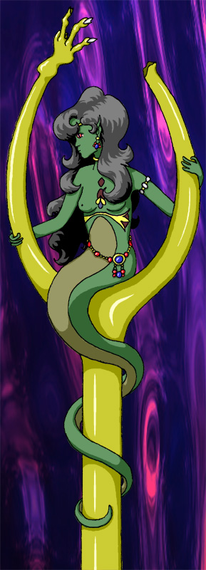 This is Gwydion's Naga. She rides around on an old, broken staff the he refuses to part with. She's basically window-dressing. He has found her to be rather useless as a familiar, and not bright enough to be a simple helper. But he's smitten and refuses to part with her as well.
